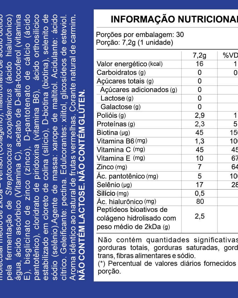Gomas flavorizadas a base de peptídeos bioativos de colágeno Verisol® para pele, unhas e cabelos, com excelente absorção no organismo, enriquecido com vitaminas e minerais quelados, que por terem alta biodisponibilidade, potencializam os efeitos do colágeno. Fonte de proteína de fácil digestibilidade e absorção (peptídeos de colágeno). Contém a dose exata (2,5g) para os…